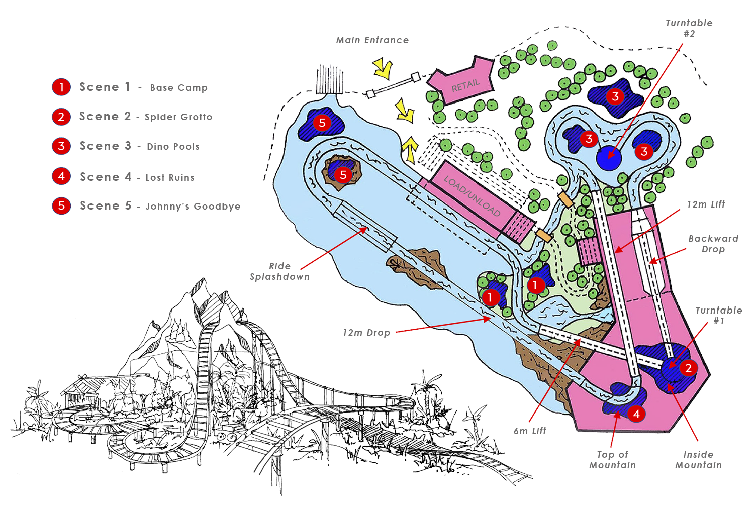 The Green Mountain was the focal point of a major flume attraction/ride called ‘Dschungel X-pedition’. The story and theming were based on a popular LEGO “Adventurers” product line.